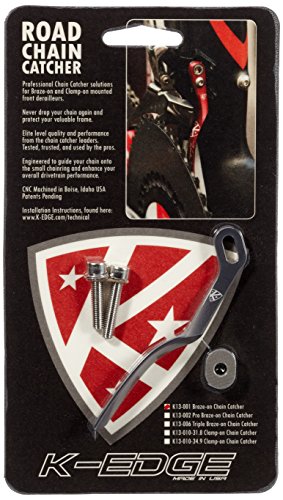 Studio : K-Edge Publisher : K-Edge Product Description The violence of the spring classics' cobbles can make a chain do bad things mid-shift. It's for this very reason that pro team mechanics have long fashioned one-off metal widgets to keep chains from dropping between the inner chainring and the bottom bracket. Like 44t Record chainrings and custom-embroidered saddles, these anti-drop chain retention devices have long been exclusive to the pros. That is, until now. With the K-Edge Braze-on Chain Catcher you get the same safeguards: your chain will never shoot inward beyond the inner chainring, giving you the confidence to slam it into the small ring at will when you round a corner on an unknown race course and are faced with the fleeting terror that comes with the first sighting of an abrupt climb. The real benefits, aside from quick and worry-free shifts, are protection for your lovely carbon fiber race bike and your chain will be right where you want it to be when you aim to grind your rivals into the tarmac. The K-Edge Braze-on Chain Catcher is made specifically for braze-on front derailleur tabs. What this really means is that you need to use either a braze-on front derailleur, or a clamp-on front derailleur that does NOT have an integrated clamp (i. e. it's a braze-on front derailleur mated to an adapter clamp.) It's made from CNC-machined 6061 T6 aluminum in Boise, ID. It weighs 10g and is available in six colors -- Black, Blue, Gunmetal, Gold, Red, and White. It comes with 2 mounting bolts -- 20mm for Shimano or Campagnolo, and a 25mm for SRAM. It's worth noting, too, that the instructions are phenomenal. 0