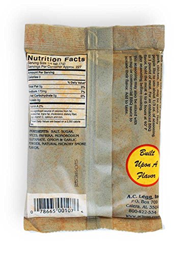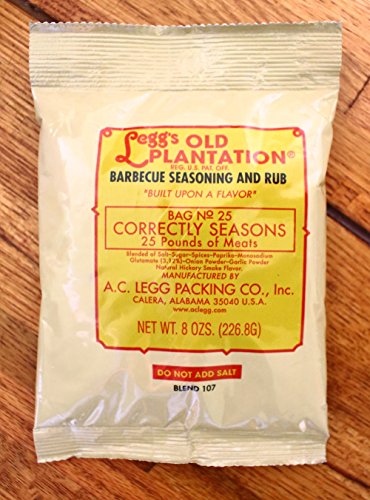 -. Binding : Misc. -. Brand : Old Plantation -. EAN : 0078665001076 -. Feature : AC Legg BBQ Seasoning and Rub Blend #107 will bring out the best in your barbecue! / Use as a dry rub or sP.R.Inkle on cooked meat. Try it on Pork Spare Ribs or a Pork Butt on your grill like the pictures to the left.Or used ahead of cooking as a marinade. / Legg's exclusive high-barrier, multi-wall packaging protects the seasoning's freshness and flavor for at least 12 months. / Works GREAT for Beef, Pork or Chicken! One 8 oz. Bag Seasons Up to 25 pounds of meat. 1 oz. seasons 3 lbs. of Meat. (2 Tablespoons = 1 ounce.)Contains Soy. / As a guideline, we use 1 Bag of AC Legg BBQ Seasoning & Rub on 2 Whole Pork Butts. We cover each Whole Pork Butt thoroughly and let set for 4 - 12 hours in the refrigerator before smoking. On a 1 Rack of Pork Spare Ribs, we use ½ Bag and marinate the same time as above before smoking. We like to smoke to an internal temperature of 150 degrees on Pork Butts. -. IsAdultProduct : 0 -. Label : A.C. Legg -. Manufacturer : A.C. Legg -. Model : Blend 107 -. MPN : Blend 107 -. PackageQuantity : 1 -. PartNumber : Blend 107 -. ProductGroup : Grocery -. ProductTypeName : GROCERY -. Publisher : A.C. Legg -. Studio : A.C. Legg -. Title : A.C. Legg INC Barbecue Seasoning and Rub - Net Wt. 8 oz. -. UPC : 078665001076