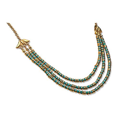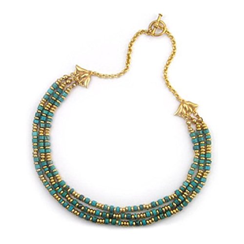 A colorful triple strand of turquoise stone and rondel beads converge at an Egyptian style lotus and toggle chain necklace. The three strand necklace features blue stones and gold-finished beads. 16" in length. Materials: One-hundred-and-eight (108) 2mm blue beads, spacer beads with gold-tone finish, toggle and bar closure.