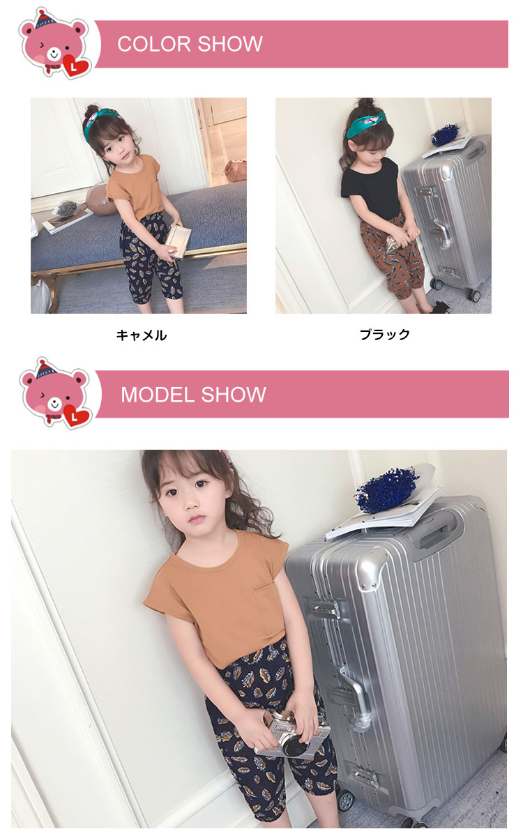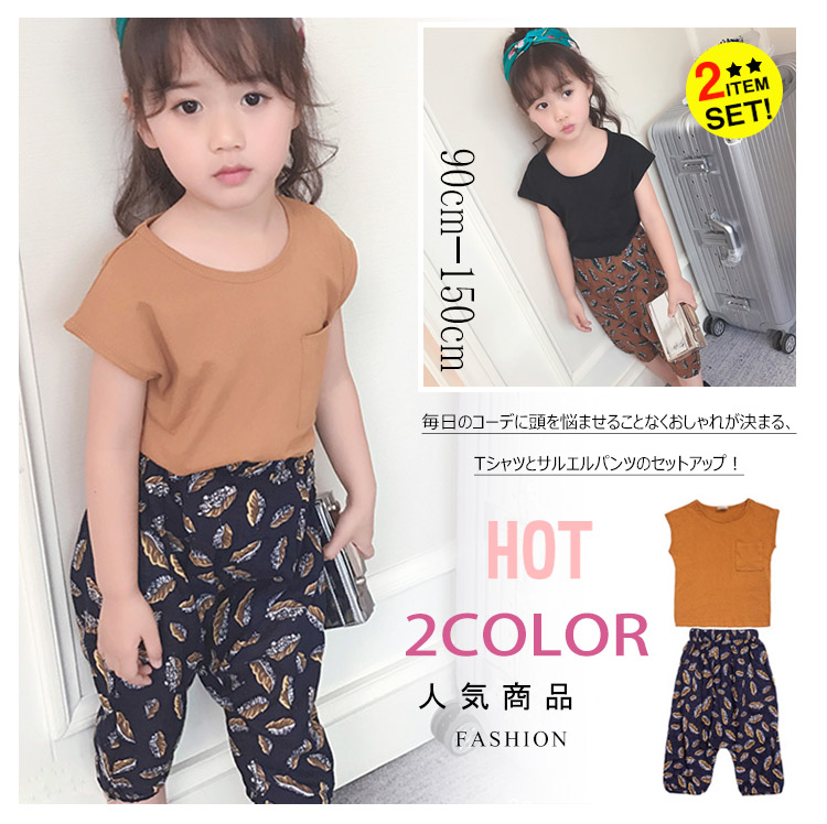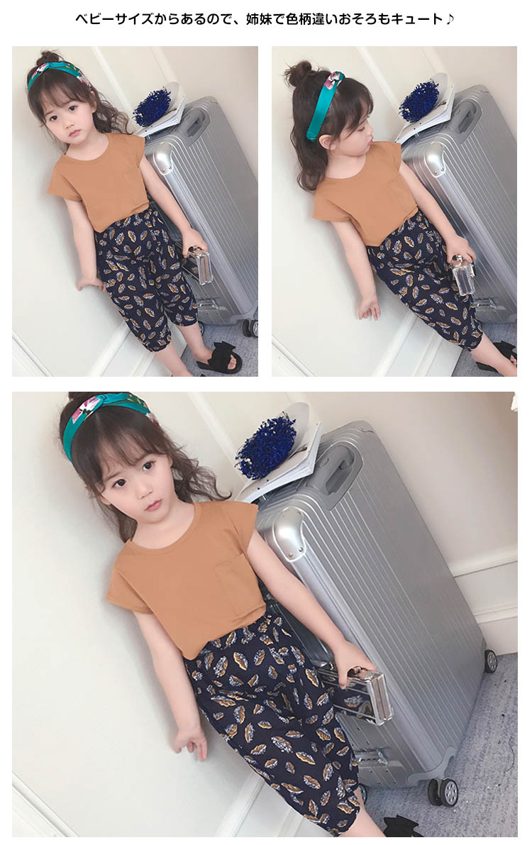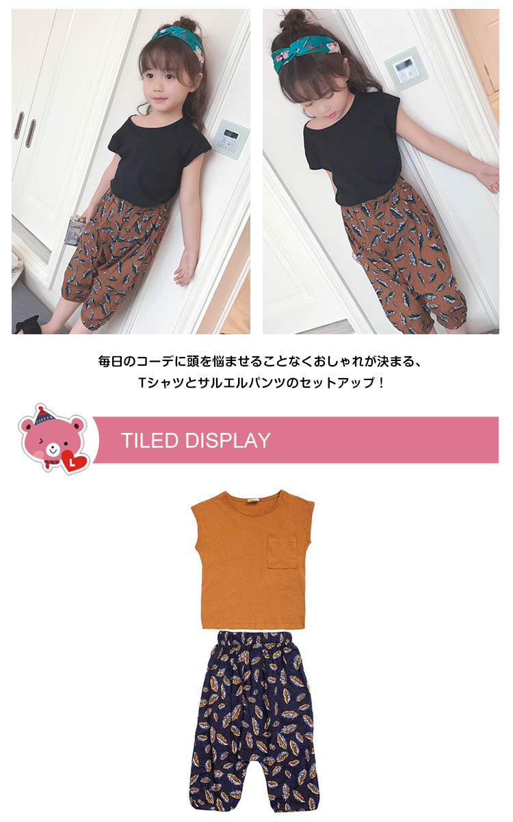 | 毎日のコーデに頭を悩ませることなくおしゃれが決まる、Tシャツとサルエルパンツのセットアップ!着まわしや単品使いにも便利なセットアップ!ベビーサイズからあるので、姉妹で色柄違いおそろもキュート♪ | |