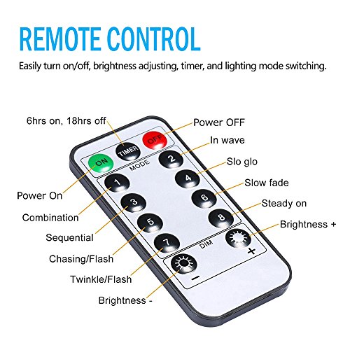 - 8 lighting modes available for choice: They are Combination/ In wave/ Sequential/ Slo glo/ Chasing/ Slow fade/ Twinkle/ Steady On. Easily change the flashing mode and the brightness is dimmable by remote.