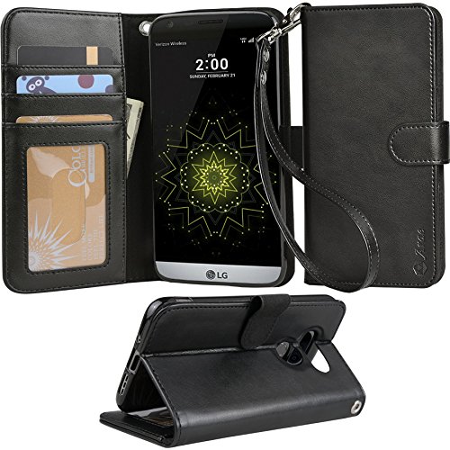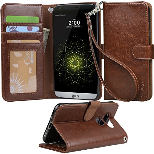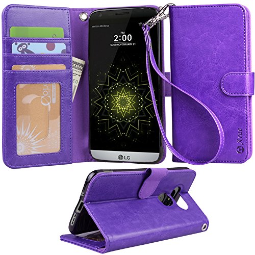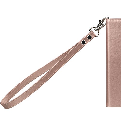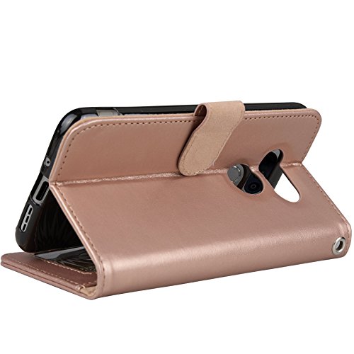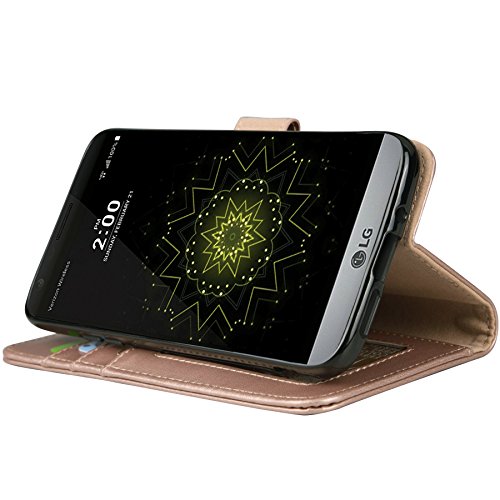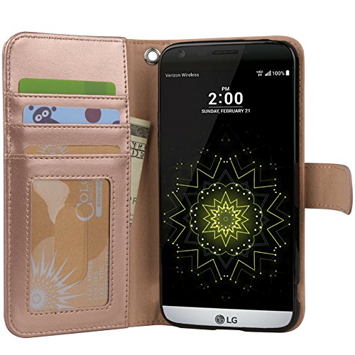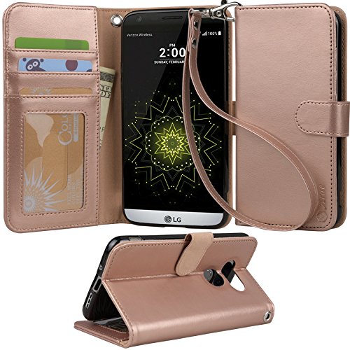 LG G5 Case, Arae [Wrist Strap] Flip Folio [Kickstand Feature] PU leather wallet case with ID&Credit Card Pockets For LG G5 (rosegold)