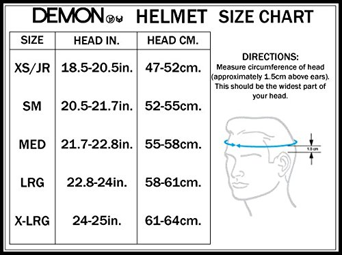 -. Brand : Demon United -. Feature : Audio built into your earpads - Can use with or without audio. / Smooth ABS shell and EPS foam padding. CE and ASTM certified / Comes with free Balaclava face mask. / Vents in the front and back of the helmet will keep you cool. / SIZE: XS (47-52 cm) SM (52-55 cm) MD (55-58 cm) LG (58-61 cm) XL (61-64 cm) -. IsAutographed : 0 -. IsMemorabilia : 0 -. Label : Demon United -. Manufacturer : Demon United -. ProductGroup : Sports -. ProductTypeName : OUTDOOR_RECREATION_PRODUCT -. Publisher : Demon United -. Studio : Demon United -. Title : Demon Phantom Helmet with Brainteaser Audio and Free Balaclava