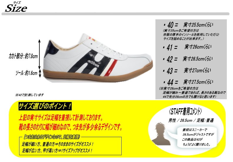 | サイズ | 作り⇒幅細め 【サイズ選びのポイント!】 足幅が細い方、普通の方⇒そのままのサイズがオススメ! 足幅が広い方、甲が高い方⇒1サイズアップがオススメ! |