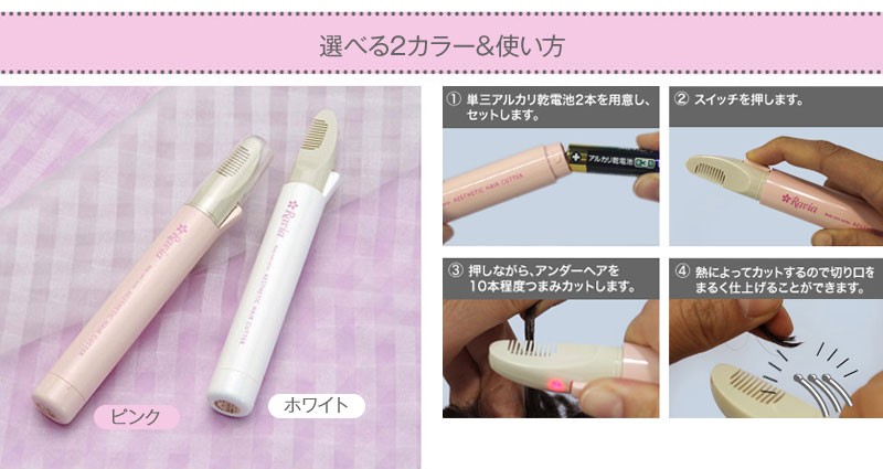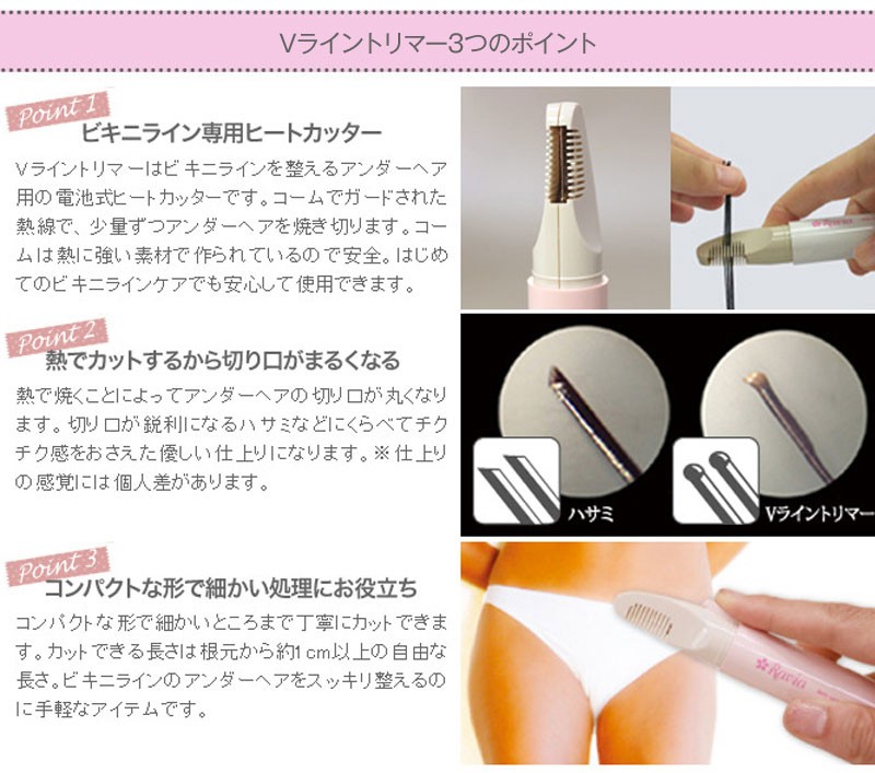 | 使用上のご注意 | ・電池は別売です。単3アルカリ電池2本をご用意ください。電池の残量によってカットできる能力に大幅な差がでます。 ・連続使用時間は新しい乾電池で30分です。電池を入れたまましばらく使用しなかった場合、電池の自然放電により2回目のご使用でもカットできない場合があります。まずは満充電された電池に交換をお願いいたします。無理な力を加えると熱線に負担をかけ、断線いたします。 ・アンダーヘアは個人差が大きく、ご使用後のチクチク感や突き出しにくさに差があります。 ・カットしにくい場合は残電量が少なくなっている可能性があります。無理にご使用になった場合、熱線が変形し、故障の原因となりますので、電池を新しいものにお取替えください。 ・保証書についてのお願い。 ご購入後保証書に販売店の印がない場合は、お客様ご自身でご記入ください。保証書はメーカー製品であることの確認にも使用させていただきますので、保証期間が過ぎた後も大切に保管してください。メーカーでの修理交換の際に提示が必要になります。 |