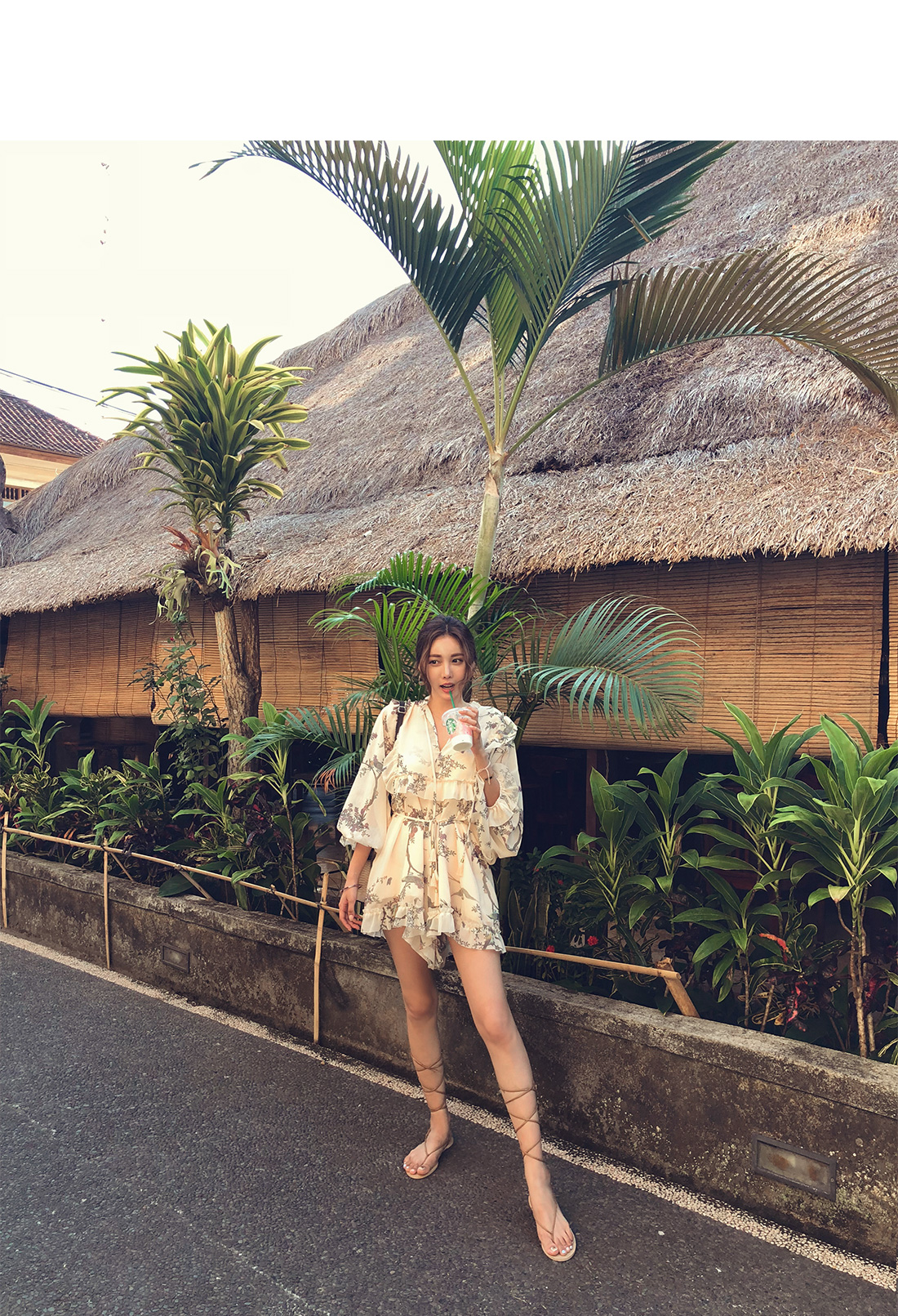 네크라인에는 스트랩이 달려 있어 묶어서 연출이 가능한데요.
