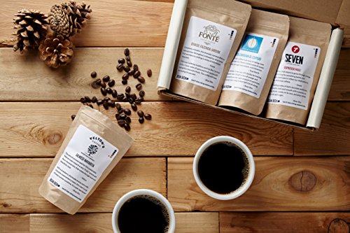 Nearly a half pound (4, 1.8 ounce bags) of whole bean coffee, tasting notes, and roaster profiles