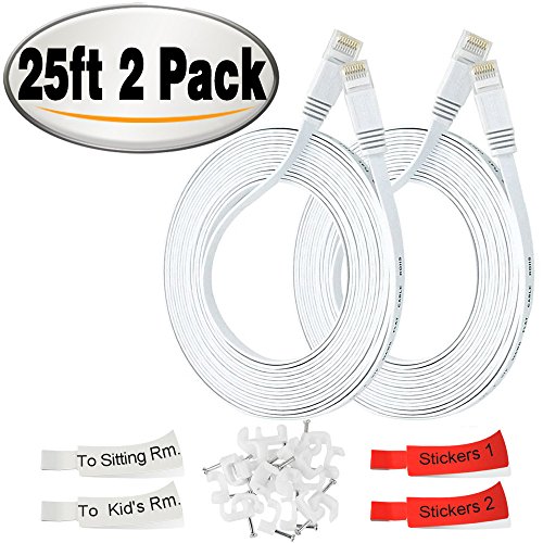 Cat 6 Ethernet Patch Cable Flat 25ft(2 Packs With 2 Labels),Fast than Cat5e/Cat5,Short Network Cat6 Cable Patch,25 ft Slim Internet Cable Computer/Gaming Ethernet Cord Snagless RJ45 Connectors White