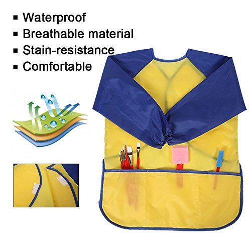 This kids art smock is designed for protecting clothes from paint, ink, and other potentially messy mediums, so children can create while staying neat and clean. Inspired young artists can let their creativity flow with the creativity smock Hyanwoo kids art smock protect children in the kitchen or during art projects Great for school, arts and crafts and more! Ages 3 , One size fits most. kids art supplies,art easel,craft supplies. Specifications: Color: Yellow/pink/blue Features: Waterproof, 3 roomy pockets, adjustable nylon back velcro Manufacturer Suggested Age: 3 Years and Up Product Size: 1.44 x 1.8 Ft, 44 * 55 CM Package includes: 1x Hyanwoo art smock NOTE: Paints and brushes are not included 0