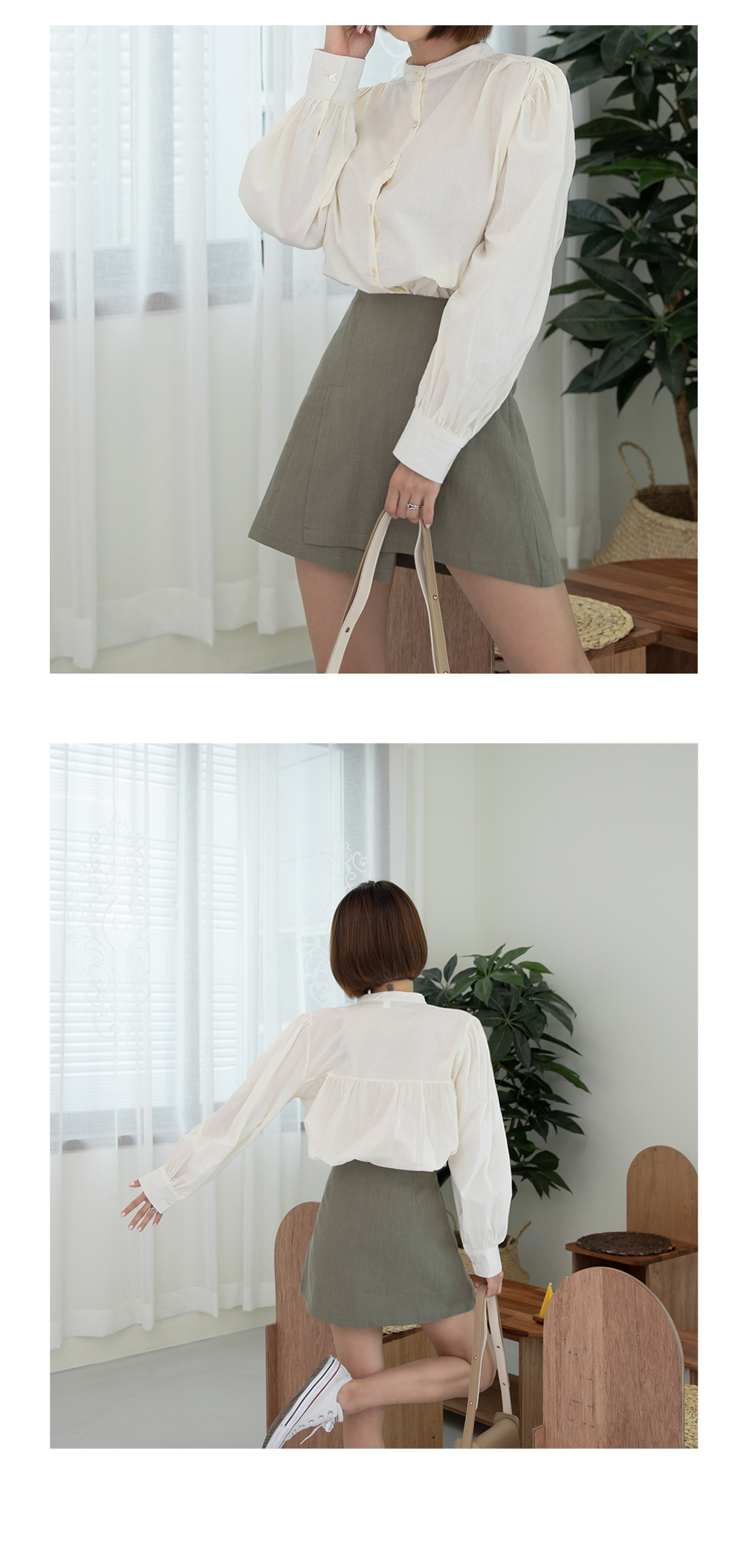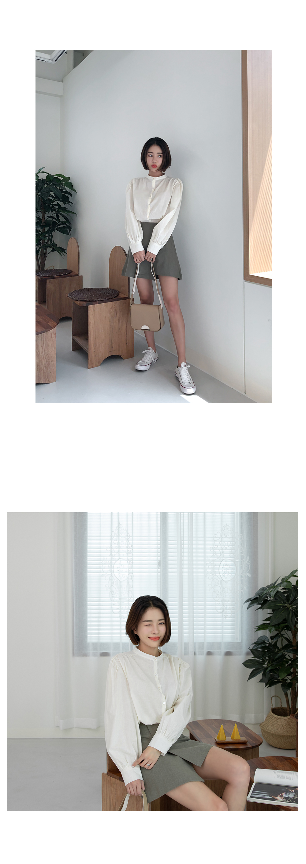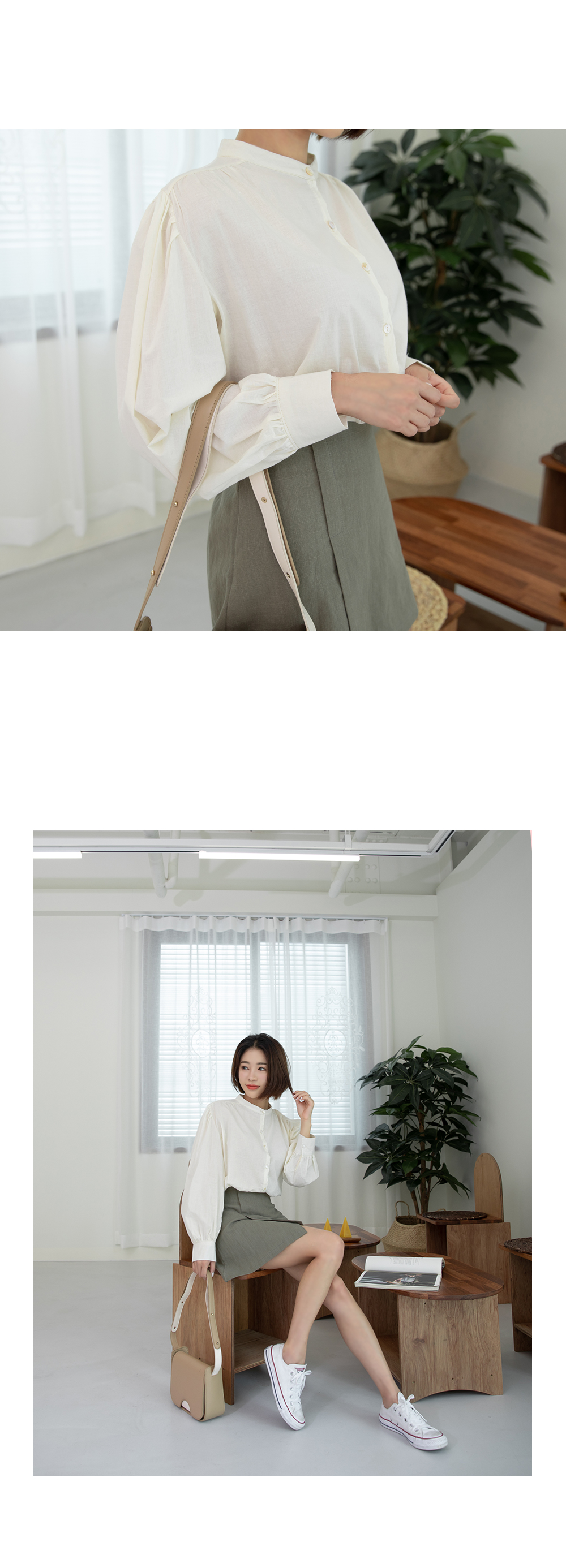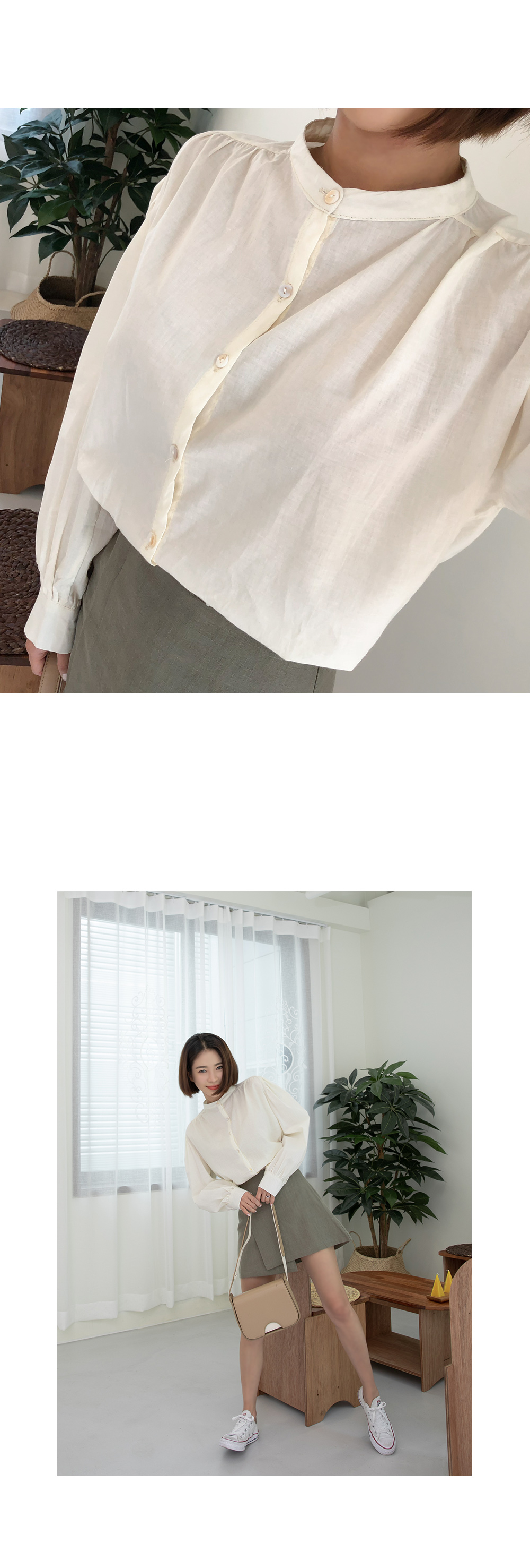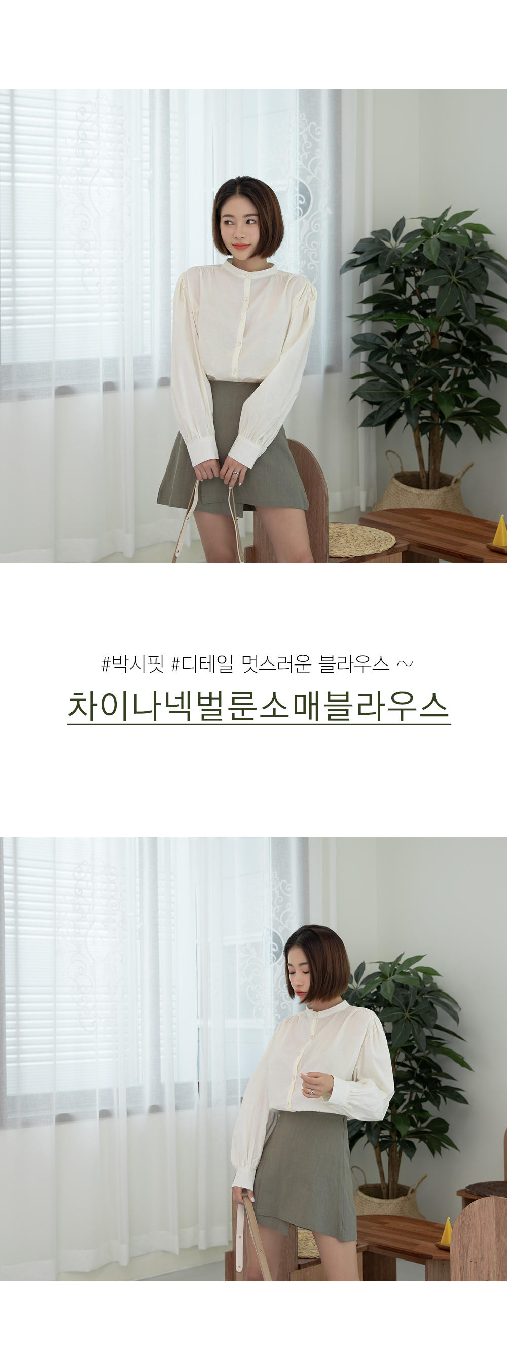 차이나넥으로 깔끔하며 벌룬소매와 어깨에 살짝 들어가있는 셔링이 포인트에요~