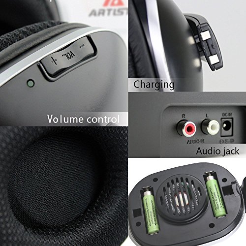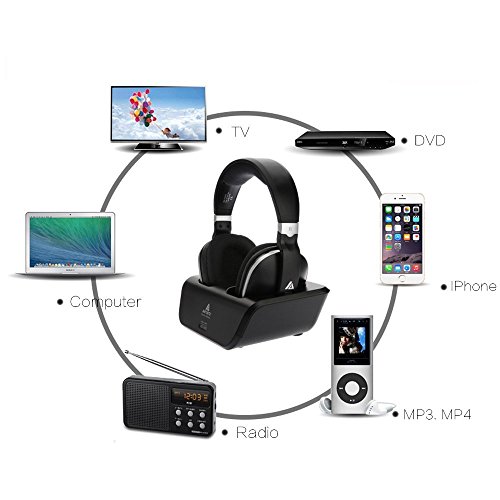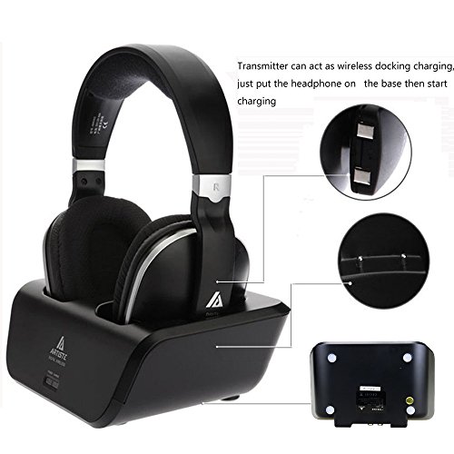 Wireless TV Headphones, Artiste ADH300 2.4GHz Digital Over-Ear Stereo Headphone for TV 100ft Distance Transmitter Charging Dock Rechargeable (Black)