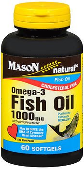 Mason natural omega-3 fish oil 1000 mg softgels Dietary Supplement. Cholesterol free. May reduce the risk of coronary heart disease. Purified to eliminate mercury. Omega-3 fish oils help contribute to overall heart health and good blood circulation. Supportive but not conclusive research shows that consumption of omega-3 fatty acids may reduce the risk of coronary heart disease. Laboratory tested. Guaranteed no added: yeast, wheat, milk or milk derivatives, lactose, sugar, preservatives, artificial color, artificial flavor, and sodium. These statements have not been evaluated by the Food and Drug Administration. This product is not intended to diagnose, treat, cure or prevent any disease.