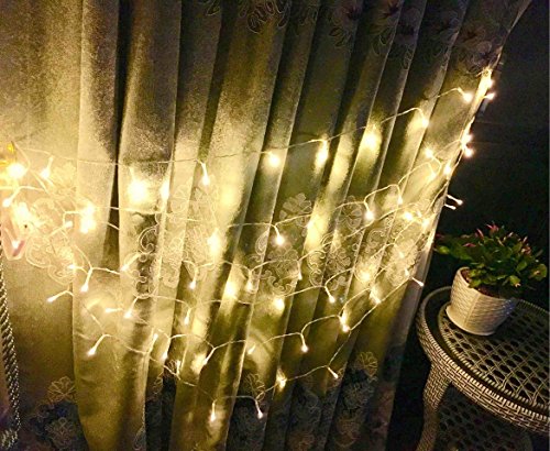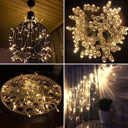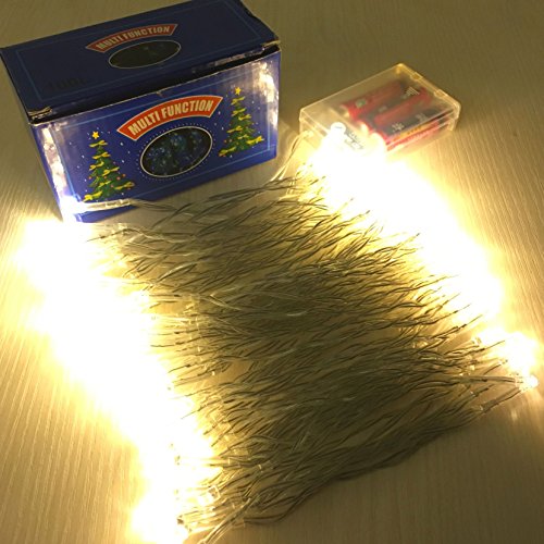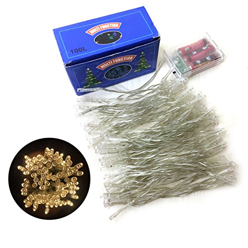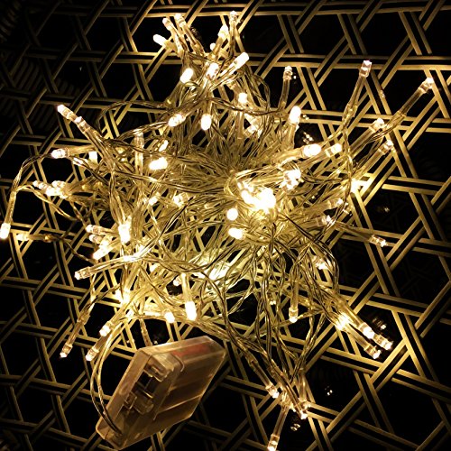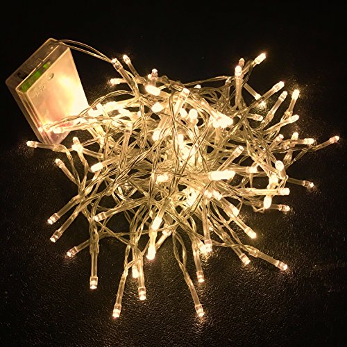 -. Feature : The must-have decorative lights. The 33 ft string lights have 100 bulbs, perfect for Christmas, wedding, New Year, Halloween, Valentine¡¯ Day and birthday party decoration, and creating warm and happy atmosphere / Battery operated and two modes. The starry string lights are powered by battery, convenient to decorate anywhere you want. It has two modes: stable and flashing to choose from / Great illumination effect. 100 warm white bulbs give excellent lighting, create party and festival atmosphere, and perfect for indoor and outdoor d¨¦cor / Easy operation. Just put in 3 AA batteries and slide the button to turn it on to stable mode, and if you want a flashing mode, simply slide the button again, and then you can enjoy the lights / Works for many occasions: indoor, outdoor, home, patio, garden, porch, bedroom, stage, hotel, square, mall, road, bar, night scene display, kitchen, and New Year, Valentine¡¯s Day, Halloween, Christmas and other festivals, wedding, birthday party and so on