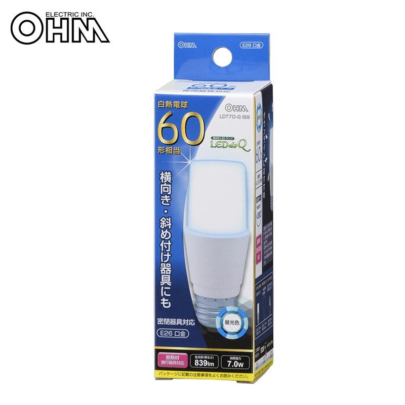 白熱電球60形相当の明るさ。密閉器具、断熱材施工器具にも対応。口金下向き器具だけではなく、口金横向き、斜め付け器具にもご使用いただけます。光色は昼光色で屋内専用です。 生産国:中国 仕様:取扱説明書(パッケージ記載) ※サプライヤー直送品 ご注文後2~3営業日後の出荷となります【商品名】OHM LED電球 T形 60形相当 E26 昼光色 LDT7D-G IS9