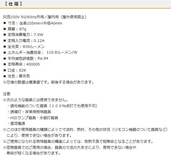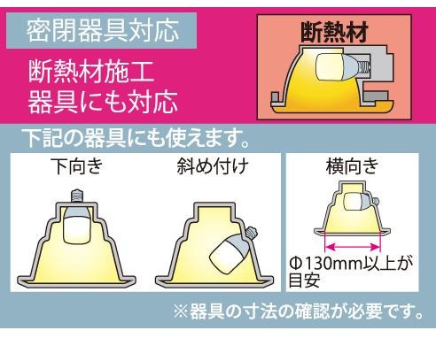 白熱電球60形相当の明るさ。密閉器具、断熱材施工器具にも対応。口金下向き器具だけではなく、口金横向き、斜め付け器具にもご使用いただけます。光色は昼光色で屋内専用です。