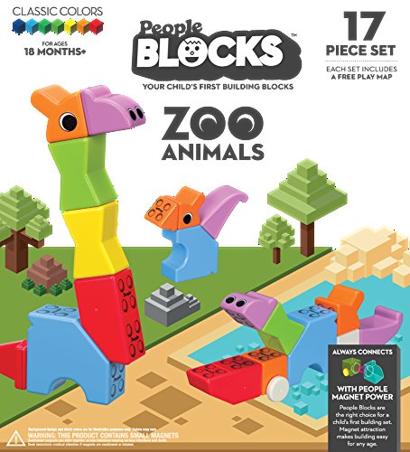 The People Blocks Zoo Animals set comes with 17 new animal inspired shapes and zoo themed play mat. Styled in our classic solid colors, this set lets you be the zoo keeper for the day and create all of your favorite animals. Great as your first set or as an addition, People Blocks are the right choice for STEM and block play 18 Months - People Blocks are perfectly crafted to fit in a child's hand and allows them to stack easily with the power of magnets 2 years - Children will develop beyond stacking to matching and pattern building as their imagination develops. Children will explore different angles, unique combinations, and asymmetrical designs. 3 years - Children begin to make anything and everything they can think of and see in their everyday activities. The possibilities are as unlimited as their young imaginations. 4+ years - With the power of magnets, your child's creativity will be seen in their own unique designs.Feature