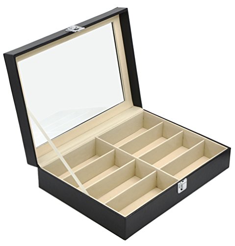 - Feature : Surface material: high-quality leather that is moisture-proof and easy for cleaning and maintenance; Inner cloth: color-fast yellow flannelette / Case size: 33.6 x 24.7x 8.3cm(13.23" x 9.72" x 3.27") (L x W x H),8 compartments hold glasses in place; Handsome accessory for your nightstand, desk, or dresser / Perfect for storing and displaying your favorite eyeglasses and sunglasses in one convenient and attractive place, or use the case to store ties, coins, or a variety of collectibles / Package: Round-sealed packaging prevents the damage of goods during transportation / An elegantly designed black storage box perfect for any tabletop surface