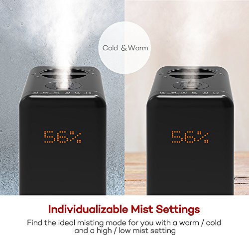Customizable Mist Settings: Comes with Cool / Warm Mist Modes (95℉/35℃); Low / High Mist; Timer (0-9 Hour); and Preset Constant Humidity (30%-95%); (Note: 95 °F is being measured at the mist outlet; warm mist humidifies faster, but at 95 °F it might still feel cool to the touch)
