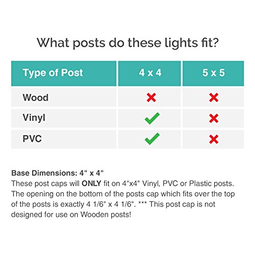 Product Dimensions - 5.75" x 5.75" x 4.5", Base Dimensions: 4" x 4" Post Size Fitting; these post caps will ONLY fit on 4" x 4" Vinyl, PVC or Plastic posts. The opening on the bottom of the post cap which fits over the top of the post is exactly 4 1/16" x 4 1/16". *** This post cap is not designed for use on Wooden posts!