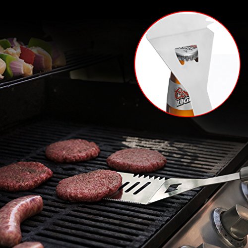- 3-IN-1 Spatula: Not just for turning over food, the spatula's three different edges cut, slice and tenderize meat. Long handles keep tools far from the fire for your safety.
