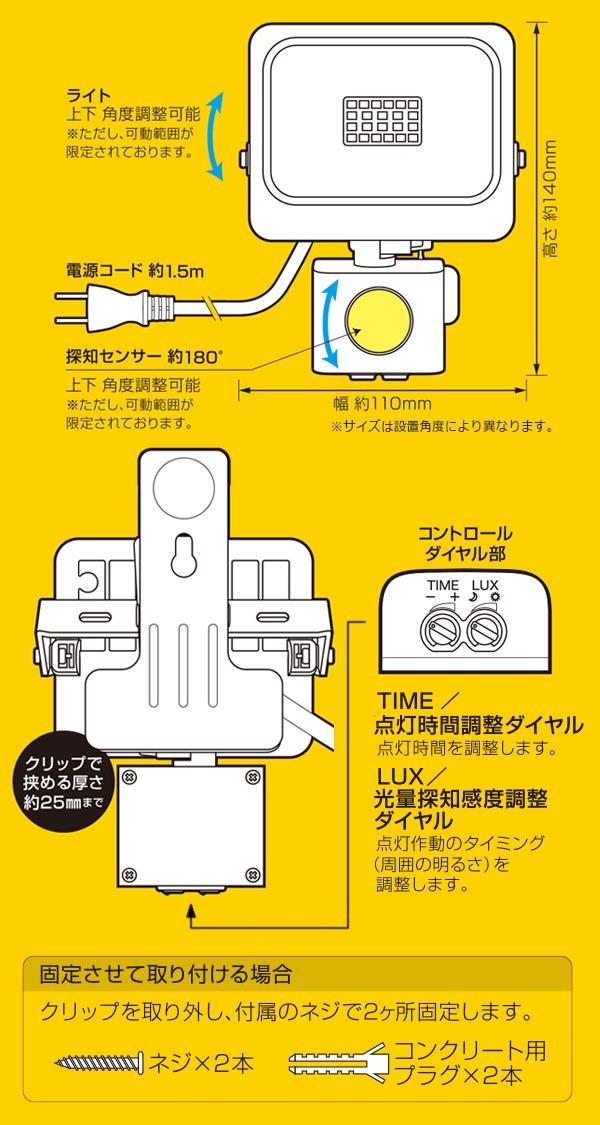 面倒な電池交換や天候に左右されないコンセントタイプのLEDセンサーライトです。防滴仕様なので玄関や軒下などに設置が可能。クリップで固定するタイプなのでDIYに慣れていない方も簡単に取り付けられます。 |