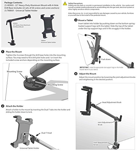 -. Binding : Personal Computers -. Brand : Arkon -. Color : Black -. EAN : 0047407408039 -. Feature : Slim Grip Holder fits tablets 8.9 to 12.9 inches in screen size, even with cases / 4 hole drill base recommended for permanent installations / Adjustable arm and swivel ball provide flexibility in viewing tablet / 2 year limited warranty -. Format : CD-ROM -. Label : Arkon -. Manufacturer : Arkon -. Model : TAB803 -. MPN : TAB803 -. NumberOfItems : 1 -. OperatingSystem : N/A -. PackageQuantity : 1 -. PartNumber : TAB803 -. ProductGroup : Personal Computer -. ProductTypeName : COMPUTER_ADD_ON -. Publisher : Arkon -. Studio : Arkon -. Title : Arkon Heavy Duty Tablet Drill Base Mount with 22 inch Arm for iPad Air iPad Pro iPad Galaxy Note 10.1 -. UPC : 168141246470