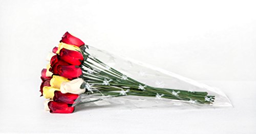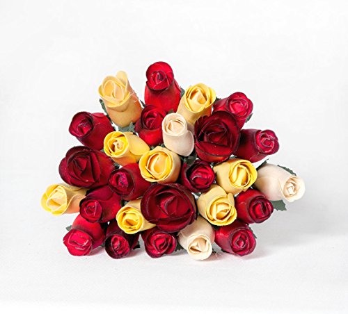 24 Wood Roses Half Opened and Regular Sized Rose Buds - Red, Yellow, White