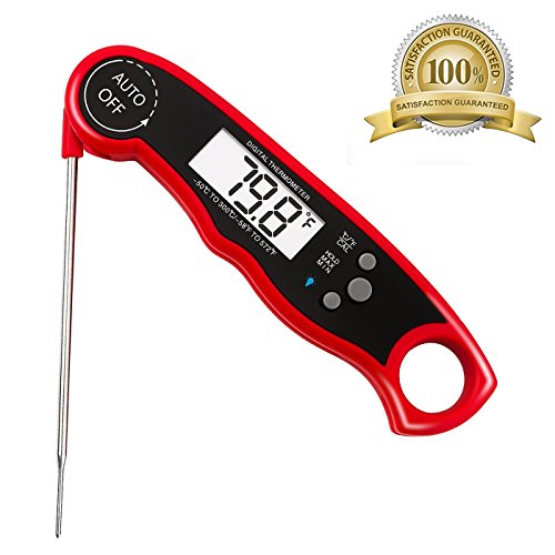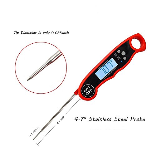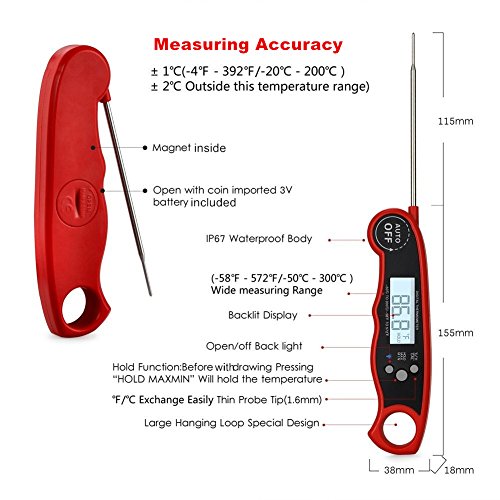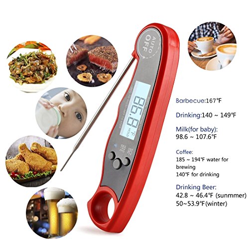 - HOLD BUTTON & AUTO ON/OFF: Before withdrawing probe,push "HOLD".It will hold the temperature reading until pressed again.Internal collapsible folding tapered probe with auto on and off.10 minutes auto off without pressing any of the buttons.Perfect for meat, liquid, food, candy tempering in kitchen and outdoor cooking.