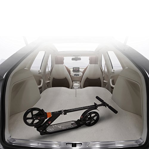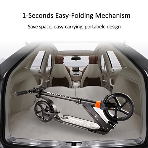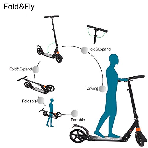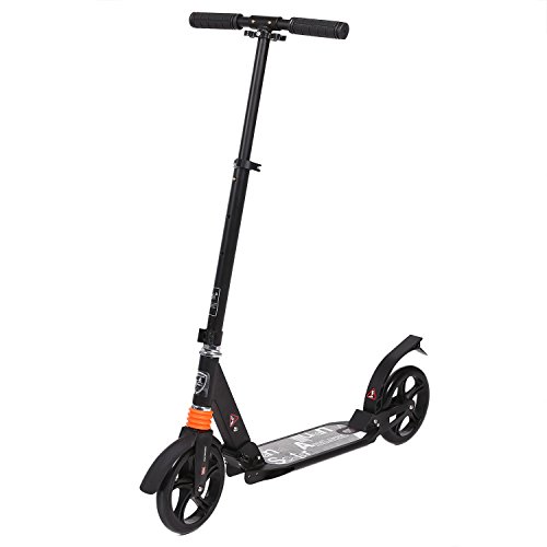 -. Feature : 3-SECONDS EASY-FOLDING MECHANISM: No assembly request, the adult kickscooter with 3-Seconds Easy-Folding Mechanism, suit for quick storage and transportation(US Stock), It's the perfect and easiest way to commut and unlike a bicycle there are no restrictions to carry on the tube, train or bus / FRONT & REAR SHOCK-ABSORBING SYSTEM: The 2 wheels scooter with high durable 205mm big wheels, Dual Suspension System, precision ABEC-7 bearings reduce vibration and make a smoother ride and creates an incredibly smooth glide, perfect for City/Urban/Suburban pavements / PATENTED REAR FENDER BRAKE: The aluminum alloy scooter features an easy to access Anti-Rust Paint Foot Rear Brakes which when pressed brings the scooter to a speedy secure stop. Large aluminum reinforced brake pedal is easy to use for quick and firm breaking fast. / ADJUSTABLE TELESCOPING T HANDLEBARS: Adjustable handlebar with soft rubber comfortable hand grips and 3 level height adjustable, range 90-100cm/35.1-39 inch, Suit for adult, teens and kids age 12 up. / SEST SUPPORTS 220LBS WEIGHT: High density durable aluminum alloy frame and 18" * 5.5" enough foot space and low to ground design reinforced heat-treated aluminum alloy deck with full-deck grip tape make this scooter's sest weight 220lbs(100kg)
