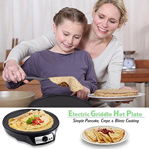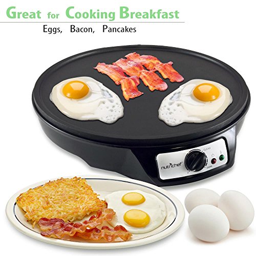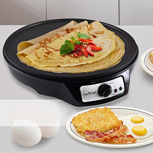 The NutriChef Electric Crepe Maker & Griddle provides you with convenient food prep ability. The compact tabletop design is easy to use, allowing you to create delicious desserts like crepes and blintzes -- or use it to whip up a quick breakfast including bacon, eggs & pancakes! The non-stick aluminum cooking surface features a wide 12'' inch diameter cooking surface with a temperature adjustable rotary control knob. Enjoy hassle-free hot plate food preparation with the NutriChef Electric Crepe Maker & Griddle.Feature