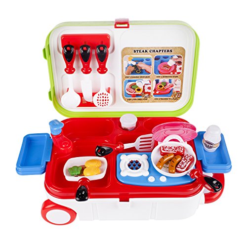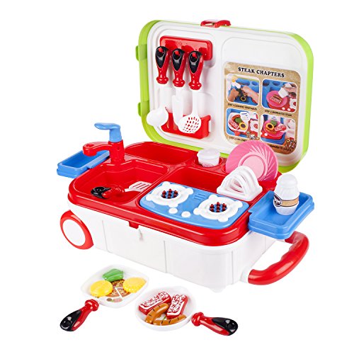 -. Feature : FUN AND ENTERTAINING COOKING SET: Each lovely Kitchen Cooking Toy Set is made precisely to ensure that your kid will fully enjoy the kitchen experience. Colorfully designed to give it that fun and cute look that is just perfect for your baby girl. / IDEAL KIDS LEARNING TOY: This lovely Kitchen Playset is especially made to develop your kids' creative and imaginative skills. This Cooking Set is realistically designed to match your kitchen accessories to give your child the best play pretend experience. While playing with our toys ensure that your kid will effectively develop her eye to hand co-ordination. / AWESOME GIFT IDEA: Is her birthday coming up? Do you want to reward her good behavior? Then our stylish Kids Cooking Toy Set is exactly what you need. You will love how she happily plays with her new Kitchen Set. / PORTABLE, CONVENIENT AND EASY STORAGE: Carefully designed with a combination of wheeled trolley case, storage box and play house toys. This 3IN1 feature enables you to pack her favorite toy for your family trip, vacation or when visiting to grandma. Made with a fastened box lock so she can safely store all her Cooking Tools when she is not using them. This Cooking Toy set is made with extra storage space to ensure that all her play toys will fit into the box. / GREAT VARIETY AND MULTIFUNCTIONAL USE: This Cooking Set comes fully loaded with serving spoons, a knife, 2 salt/ spice shakers, 2 cooking pans, an inbuilt cooking stove a replica tap and sink area just for her exciting pretend play. The box is also fitted with a lid support and hooks and an extended work bench so she has extra space and an organized cooking area while playing.