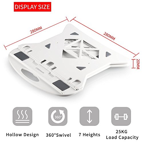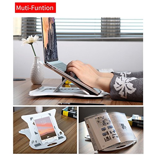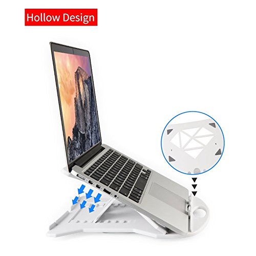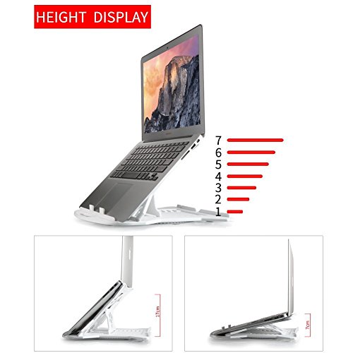 -. Feature : Adjustable height (7 positions) for increased airflow and comfortable viewing, reading, and typing / Anti-Slip feet keep your laptop in place and protects any surface it is placed on / Hollow design helps to cooling heat away from laptop / tablet / Compatible with Macbook / Laptop / Notebook / iPad and other more devices / Helps reduce neck strain and eye strain, stabilising front edge prevents laptop from sliding off stand