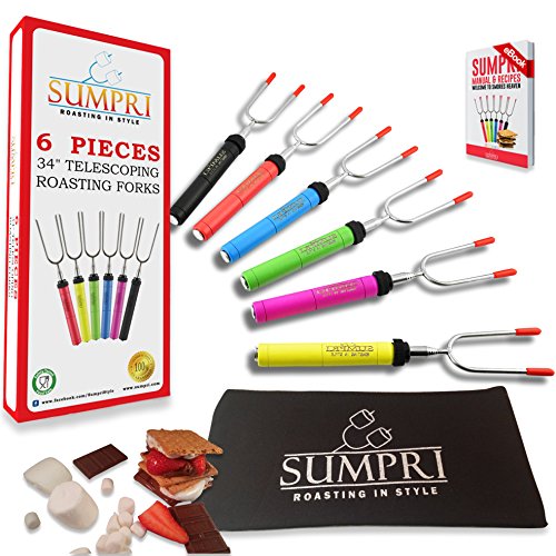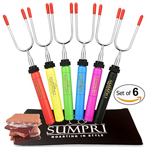 Marshmallow Roasting Sticks, Smores Skewers Telescoping Rotating Forks- SUMPRI SET OF 6 Hot Dog Fire Pit Outdoor Fireplace Campfire Accessories-6 MULTICOLORED 34 Inch Extendable Steel Fork Camping Kit