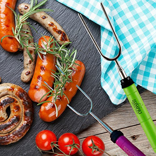 NEW & IMPROVED STURDY DESIGN WITH A THICK LIGHT ROTATING HANDLE - Featuring a strong, lightweight retractable fork & a rotating axle at a flick of your fingers to prevent marshmallow, weiner hot dogs and sausages from uneven cooking. The handles are LARGER and fit your grip perfectly, easy to hold and safely roast outdoor or in the indoor fireplace. The fork head is THICKER and prevents marshmallow's from spinning on the stick when melting allowing you to make delicious s'mores every time!