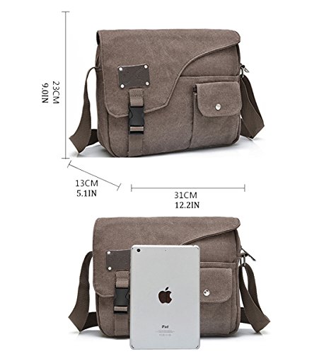 -. Feature : Main frabic :High quality canvas / Size: 12.2*9.0*5.1 inch(L*H*W). The shoulder bag fits a 12" laptop/tablet/iPad. Pls see the size dimensions before placing your order. / Classical Vintage Fashion Style. Made of soft and durable washed canvas fabric , making our bag Ideal for school, college, working, dating, shopping and traveling in every daily life occasion. / Structure: A total of 5 pockets. 1 main zipper Pocket, 2 front pocket, pockets, 1 inner Pocket, 1 back zipper pocket . / Multi-purpose & Durable. As a unisex school and business bag, it fits your laptop up to 12" and books, pens. It can also be carried for outdoor activities, such as running, cycling, camping, etc. You can chose a bag as a great gift for your friends and family.