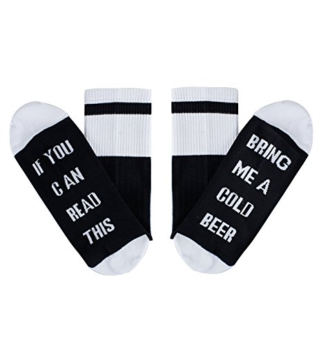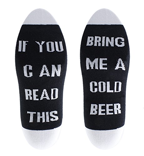 -. Binding : Apparel -. Brand : Zmart -. Department : womens -. Feature : WHY UPGRADED? Now We have two sizes for the funny socks; Sock size 9-11 fits women shoe size 4 to 9 and men shoe size 5 to 7.5; Sock size 10-13 fits women shoe size 9.5 to 12.5 and men shoe size 8 to 13; So you have no worry about the size too small or large. / SEWN IN LETTERING, NOT P.R.INTED: All the words are stitched directly into the socks instead of an iron-on transfer, so it won't peel off. Novelty socks that will make your friends giggle, here you go! / COMFY MATERIAL: Made from 80% combed cotton, soft, comfortable, stretchy and breathable. Smell free, moisture wicking, medium thickness, machine washable, hold up well in the laundry. Suit for men's slippers, sandals, casual, athletic, dress or formal shoes. / FUN GIFT: IF YOU CAN READ THIS, (PLEASE) BRING ME A COLD BEER; Grey with black lettering, wear to work, on a date, or lounging around the house! Gifts for Bridesmaids, Groomsmen, Hostess or Housewarming or Birthday Gift. / PACKAGE & 100% SATISFACTION: 1 pair in plastic zippered Zmart bag. We offer 30 days money back and Prompt customer service. Shop with Confidence. The saying will crack you up! -. IsAdultProduct : 0 -. ProductGroup : Apparel -. ProductTypeName : SOCKSHOSIERY -. Title : [UPGRADED] Zmart Funny Saying Knitting Word Combed Cotton Crew Wine Coffee Taco Beer Socks for Men Women