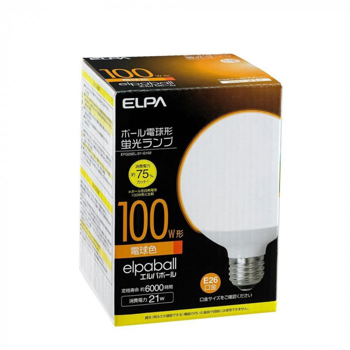 ボール電球形蛍光ランプ、電球色です。 製造国:中国 商品サイズ:全長128mm、外径95mm 仕様:口金:E26定格消費電力:21W定格入力電流:330mA定格寿命:約6000時間全光束:1370lm光色:3波長形電球色交流電源100V 50/60Hz共用屋内用 ※サプライヤー直送品 ご注文後3~4営業日後の出荷となります【商品名】ELPA(エルパ) ボール電球形 蛍光ランプ 100W形 電球色 EFG25EL/21-G102