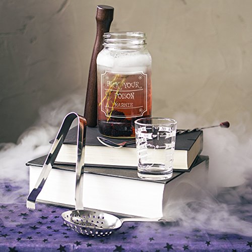 -. Feature : Sold in a set of one (1) mason jar, one (1) shot glass, one (1) muddler, one (1) strainer, one (1) bar spoon, and one (1) set of tongs / Features mason jar engraved with "Full of Boos" design and set of five (5) bar tools / Made of glass, stainless steel, and wood / Hand wash all tools, jar dishwasher safe / Mason jar holds up to 26 oz. / Shot glass holds up to 4 oz.