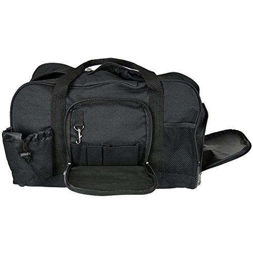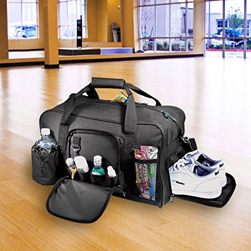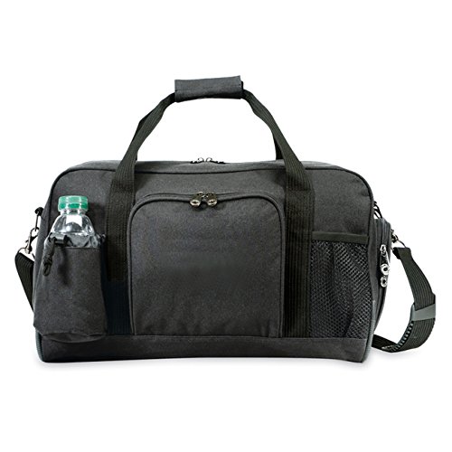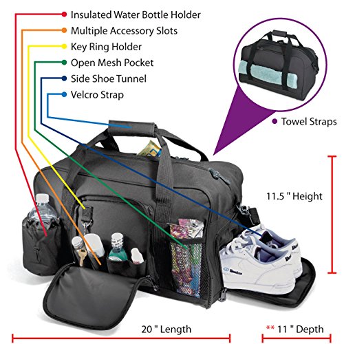 -. Feature : FEATURE: Duffel bag made of 600 Denier. Top zipper closure main compartment. Front zipper pocket with interior organizer. Front side insulated adjustable water bottle holder and open mesh pocket. Backside holder straps for towels, jacket. SIDE SHOE TUNNEL with zipper closure. Comfortable padded carrying handle. Detachable/adjustable padded shoulder strap. / MATERIAL: 600D Polyester gym bag, travel bag, duffle bag, hiking bag, camping bag. / ITEM SIZE: 20"W x 11.5"H x 11"D / AVAILABLE COLOR: Black / USE FOR: Gym, yoga, travel, and other sport events. Sports duffel bag great for gym and traveling