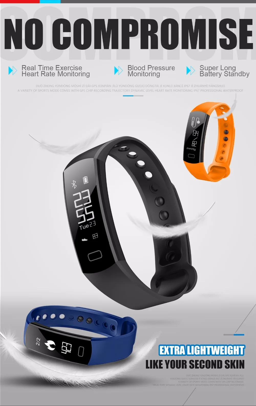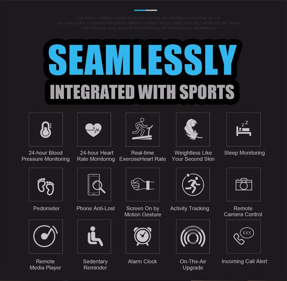 Function:Passometer,Social Media Notifications,Sleep Tracker,Alarm Clock,Push Message,Activity Tracker,Message Reminder,Heart Rate Tracker,Call Reminder,Fitness Tracker,Blood Pressure,Remote Control,Blood Oxygen