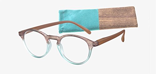 -. Title : Women's Round Reading Glasses Aqua/Brown with Wood Patterned Temples By ICU Soft Case (2.25)