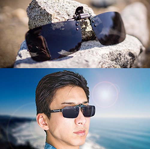 IMPORTANT: CHECK THIS FOR OPTIMAL FIT FIRST These lenses are designed to be sufficiently large enough to cover a variety of eyeglasses, cover gaps and minimize peripheral light leakage. HOWEVER, these will ONLY fit for eyeglasses that are less than these dimensions: Lens Dimensions: 1.5in X 2.3in or 38mm X 58mm *Your glasses lens CANNOT be bigger than this HOW TO TEST Polarization: 1.) Hold lenses in front of a LCD monitor 2.) Rotate lenses 90 degrees 3.) The polarization will "remove" your monitor display visually POLARIZING Technology These polarized lenses will enhance driving safety and overall vision by reducing reflections and glare on the road and from other cars. May also be used to reduce water reflection for fishing experience by letting you see through the water better. PROTECT Eyes from Harmful Rays These UV400 Lenses absorbs over 99% of harmful UVA/UVB spectrums. They are designed to be DARK enough to allow you to comfortable see without squinting on SUNNY days. POLYCARBONATE Rimless Lenses The lenses material used is an extremely LIGHTWEIGHT yet DURABLE and SCRATCH RESISTANT type of plastic. It is virtually unbreakable and can withstand a high amount of flexing force. COMPACT Flip-up Clip-on Mount The shortened mounting clips provide enhanced comfort compared to longer designs. You can conveniently snap at mid and high positions when driving into a tunnel or when temporarily not requiring shades. Simply flick lenses up to lock into mid and high positions. FORWARD FACING 1-Handed Mounting The 1-hand usage design allows for natural clipping action from the front. Provides safety and convenience so you can drive with one hand and clip on with the otherFeature