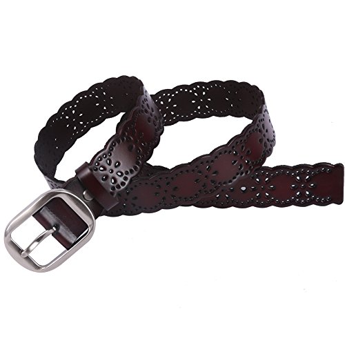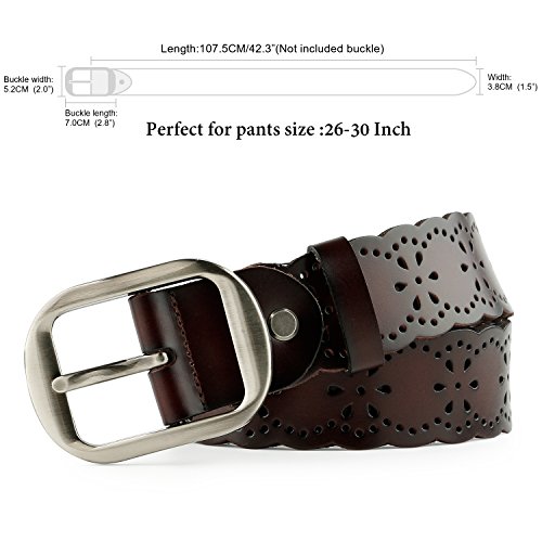 JasGood Women's Hollow Flower Design Genuine Cowhide Leather Wide Waist Belt With Alloy Buckle for Jeans-- as a perfect decoration for your outfit and it would be fashion to wear for any occasion and would help liven up your outfit. JASGOOD Women Belt JA018 Product Features: 1.Belt Size:The total length not included buckle is 107.5cm(42.3 Inch), included buckle is 111cm(43.7 Inch). Strap width is 3.8 cm(1.5 Inch). 2.Buckle Size:Buckle length: 7 cm(2.8 Inch), Buckle Width:5.2cm(2Inch). 3.Material: Genuine Cowhide Leather Alloy Buckle 4.Hollow flower design makes the belt more unique and fashion. 5.If the belt is too large to you, you can cut off a piece of the buckle area or punch a hole in the belt. 6.Suitable for ladies for everyday casual wear to formal occassions Notice We guarantee the quality of our products, but sometimes because of the different display color factors and shooting when ambient light and other factors, so in a sense of color and material will be slightly different , We hope you can understand.