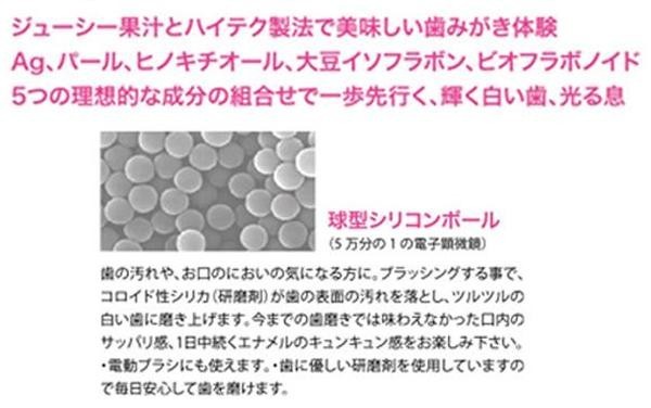 | 成分 | 湿潤剤:ソルビトール、グリセリン、PG、研磨剤:シリカ、ポリ乳酸、収れん剤:アルクロキサ、粘度調整剤:セルロースガム、保存剤:安息香酸Na、甘味剤:キシリトール、ステビオシド、着色剤:黄4、パール、黄5、銀、香料:メントール、西洋ハッカ油、香料、ヒノキオール、アネトール、カルボン、潤滑剤:アミノカプロン酸、ビオフラボノイド、ダイズイソフラボン、起泡剤:ラウリル硫酸Na、溶剤:水 |