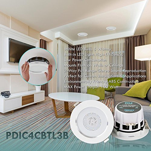 The Pyle In-Wall/Ceiling Bluetooth Speaker Kit delivers effortless sound to any room in your home or office. Each speaker features a built-in LED light and aluminum frame housing basket that provides an extra line of safety and heat-resistance. The included Bluetooth controller allows for wireless music streaming ability and doubles as a sound processing digital amplifier. Round style speaker design makes them perfect for any custom audio application on virtually any flat surface, without cluttering floor space. Integrated spring-loaded clips provide secure and flush wall mounting while stain-resistant grill covers and ABS construction add extra appeal. Included cut-out template makes installation easy. Achieve wide-ranged wireless sound performance and add audio to any room with the Pyle In-Wall/Ceiling Bluetooth Speaker Kit with Built-in LED Lights.