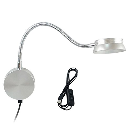 LED Wall Lamp WAYCOM 6W Gooseneck Reading Light Silver- USB Night Lighting Lamp with Switch for Bedroom/Living Room - Yellow/White Color Adjustable