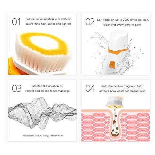 - 2-in-1 Dual brush Smart beauty device, like the delicate touch of a professional. 7000 micro-vibration per min. provides the least irritation to your facial skin, but effective make up and cleansing. Patented 3D vibration will massage your facial muscles back to youth!