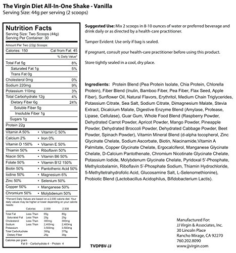 -. Feature : FROM NEW YORK TIMES BESTSELLER & CELEBRITY NUTRITIONIST JJ VIRGIN: Perfect for all three cycles of The Virgin Diet and all three cycles of Sugar Impact Diet. / PREMIER PLANT BASED PROTEIN SHAKE: Delicious blend of pea protein, chia, and chlorella. Dairy-free, gluten-free, no artificial sweeteners. / VEGAN AND VEGETARIAN FRIENDLY: Enjoy a shake a day for optimal weight loss / HIGH PROTEIN LOW SUGAR: 22 grams of protein and only 1 gram of sugar per serving. / CLEAN PLANT PROTEIN SOURCE: Includes a boost of probiotics, fiber, fruits and veggies in this tasty, smooth powder that mixes easily. Like ALL of JJ Virgin's Shakes, these are free of gluten, dairy, egg, soy, peanuts, GMOs and artificial sweeteners and work for all three cycles of The Virgin Diet and all three cycles of Sugar Impact Diet.