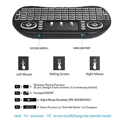 Features: Multifunction: Wireless Keyboard + Touchpad + Mouse + Multimedia control keys and PC gaming control keys.