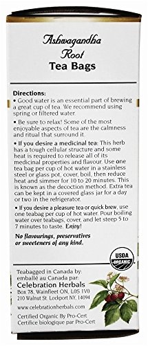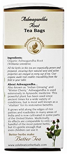 About Ashwagandha ...Also known as "Indian Ginseng" and "Winter Cherry," Ashwagandha is used extensively in Indian healing systems (Ayruvedia). It grows wild along the edges of rice patties and roadsides in many areas of India and is now cultivated in some parts of the United States. Medicinally, its effects are comparable to only a handful of the most potent herbs such as Asian Ginseng or Echinacea, but it's gentle enough on the human system that even children can use it. It all starts with the herbs. Celebration Herbals is dedicated to bringing you the best tasting teas, grown and processed as close to "the way nature intended" as possible and never irradiated. Our herbs are grown and harvested with the highest standards of quality control. You can trust our new special designations - Certified Organic, Ethically Wildcrafted, and Pure Quality. We are committed to the environment. In this box you won't find any strings, tags, or staples in our chlorine free bags. In addition, our boxes are made from 100% recycled board. A resealable freshness bag is used to extend the quality and life of your tea. We hope you enjoy the beneficial pleasure of drinking these teas as much as we have enjoyed blending, hand crafting and packaging them for you. Herbally Yours,Celebration HerbalsFeature